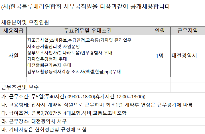 블루베리의무자조금 사무국직원 공개채용